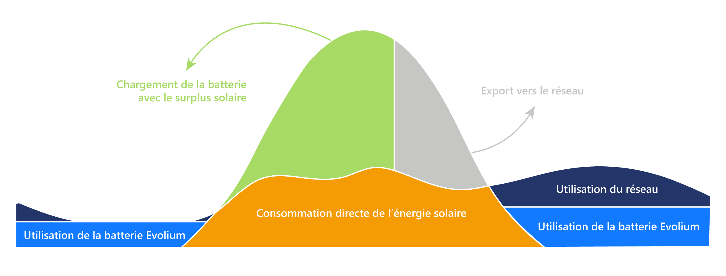 • Optimisation de l’autoconsommation : La batterie Evolium stocke l’excédent de production solaire pour l‘utiliser plus tard.
